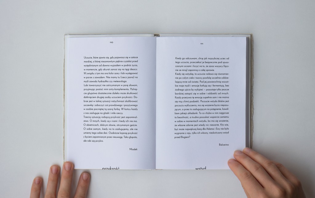 Swój dyplom zrealizowałam w pracowni projektowania książki pod opieką prof. Macieja Buszewicza. Moja praca to książka zatytułowana „[bez tytułu]” będąca swoistą wariacją na temat słownika. Zawiera 100 zebranych przeze mnie, subiektywnych definicji wybranych uczuć i emocji, napisanych przez 100 różnych, mniej lub bardziej, a czasem w ogóle nieznanych mi osób. Przyporządkowywanie haseł do osób odbywało się za pomocą losowania. Zależało mi na tym, aby definicje te były osobiste, naturalne i prawdziwe. Starałam się możliwie jak najmniej ingerować w tekst, aby zachować intymność i indywidualny charakter każdej wypowiedzi. Kolejność w jakiej występują nie jest przypadkowa; znalazłam swój własny system porządkowania. Momentami emocje narastają by po chwili znów opaść lub brutalnie zmienić kierunek. Definiowanie czegoś w zasadzie niedefiniowalnego nastręcza kłopotów, ale podjęcie takiej próby może być cennym doświadczeniem. Pozwala lepiej zrozumieć odczuwane emocje, odnaleźć ich przyczynę i wreszcie pozwolić sobie na świadome przeżywanie ich, a nie ciągłe zaprzeczanie i spychanie na bok.